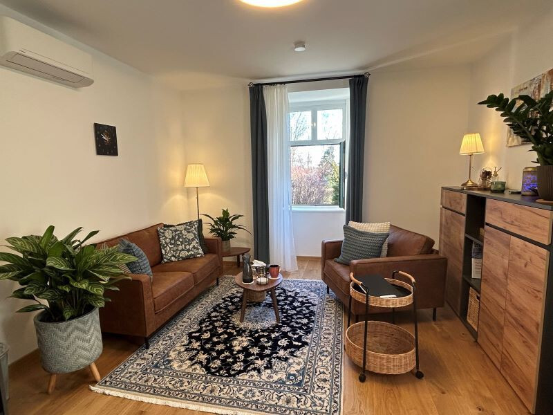 Meine Praxis befindet sich im sanierten Tiefparterre einer wunderschönen Barockvilla im 13. Wiener Gemeindebezirk. Die Räume wurden nach der Sanierung liebevoll eingerichtet und bieten eine angenehme Atmosphäre zum Wohlfühlen. Außerdem ist die Villa von einem großen Garten umgeben, sodass man vom Praxisraum direkt hinaus ins Grüne blickt.